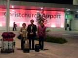 モーテルから空港まで10分。Christchurch Airport と書かれているライトアップされたガラスの前で記念撮影。4歳離れた兄弟たち。成長する過程で、ときには互いに