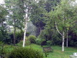 午後4時20分突然の激しい雨。フィービーは家の中にいたが、ソフィーは外にいて、物凄い形相でサンデッキの上に駆け上ってきた。玄関先の箱に跳びのって雨を見ている。フィービーも家から出てきて丸イスにすわる。フィービーはリラックスしているが、ソフィーは両耳を立て、雨をにらみつけている。急に雷が鳴り、どしゃぶりの雨が降ってきて、怖かったのだろう。それにしても、ありがたい雨。今朝大根の種をまいておいてよかった。