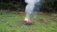 気温が急激に下がったので、庭の木もきれいに色づいてきた。午後、思うように文章が書けないので、気分転換に村を一周することに。イノシシよけの電柵沿いに北に歩くと、竹入隆行さんの先祖の墓がある。その前を通って更に北へ。人影が見えた。近づくと友人が、昨年だか一昨年だか植えたという数本の梅の木の世話をしていた。