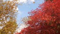 11月になったと思ったら、もう4日も過ぎてしまった。昨日は時々小雨の降る天気で、庭のモミジもくすんで見えたが、今日は一転、爽やかな秋晴れ。青空に、モミジの赤が映えてきれいだった。
