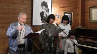 何か演奏するか歌ってほしいとお願いすると、「私は音楽が好きなのに、歌も下手ならピアノも下手で、人様にはとても聞かせられません。私が歌ったりピアノを弾いたりすると家族は逃げ出し犬だけが聞いてくれました。その犬は2匹とも老齢で死んでしまい、聴衆はいなくなりました」と、謙遜した返事が返ってきた。できたら「知っている歌を皆さんと一緒に歌いたい」とおっしゃっているで、その夜のオープンマイクには60年代のアメリカのフォークソングをフーテナニー風に歌うコーナーを設けたいと思う。