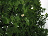 柿の葉を採っているとき横を見ると、朴の木の葉も大きくなっていた。その葉に隠れるように大きな白い花がいくつか咲いていた。夕方だったので写真では灰色がかっているが、純白の花で、蓮の花のような形をしている。