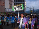 今村区参加者は、子供たちも含め60数名。区民のおよそ30パーセント。区旗をもって先頭を歩く。時々振り返って見ると、練習の成果あり、今村区連の、特に女性陣の、おどりは、見事に揃っている。終了後、公民館にて慰労会。長いポールの先につけられた区旗はけっこう重く、今でも右腕が少し痛む。