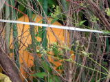 早朝、部屋で仕事をしていると、家人の声。「サルがいるよ」。カメラをもって2階のベランダへ。山裾の電柵の近くに何匹か。そのうちに隣のおじさんが山に向けてロケット花火を何発か打つ。花火の音がするとサルたちは山の中に逃げ込むが、しばらくするとまた出てくる。おそらく山の中でこちらの様子を見ているのだろう。外に出ると家人が言う。「カボチャがやられたみたい」。ガレージの横へ行ってみると、ジャンボカボチャに新しい食べられた跡。確かにかじってはいるが、彼らにとってもこのカボチャは一筋縄ではいかないようだ。