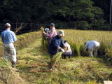 8時から、沢底の薮田ファームでの稲刈り。全部で6面ある田んぼのうち、ひとつだけを手で刈り、あとは機械で刈るとのこと。総勢30名ほど。少し刈ると、背中から腰が痛くなる。休みながら続ける。みんな素人である。最初はどうなることかと思ったが、数の力は凄い。休憩を挟み、11時ごろまでには、刈り終わり、はぜにかける作業。これが大変だった。稲の重みで、はぜが2度も倒れてしまった。そのつど、やり直し。疲れた。しかし、田植えほどではない。