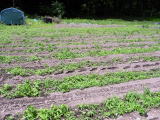 1列目、左から網を張ったジャガイモ、ヒマワリの芽。ヒマワリの種をまいた畑。緑の部分は雑草。山際まで全部で15列ある。2列目は、こんにゃく芋の芽。これは珍しい。ブロッコリー、ズキニ。3列目、サトイモ、トマト、サツマイモ。4列目、スナップエンドウ、トウモロコシ、ゴーヤ。5列目、ナス、ピーマン、カボチャ。